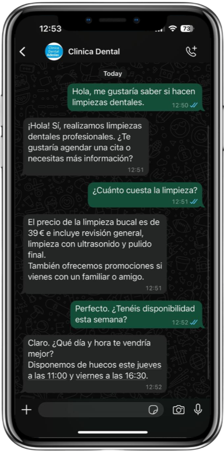 "Nuestros clientes ya no tienen que llamar para pedir cita. El bot responde al instante y les guía en todo el proceso. Hemos reducido las llamadas en más de un 60%"